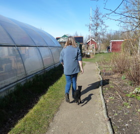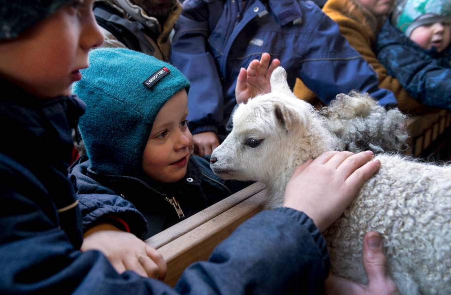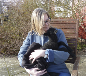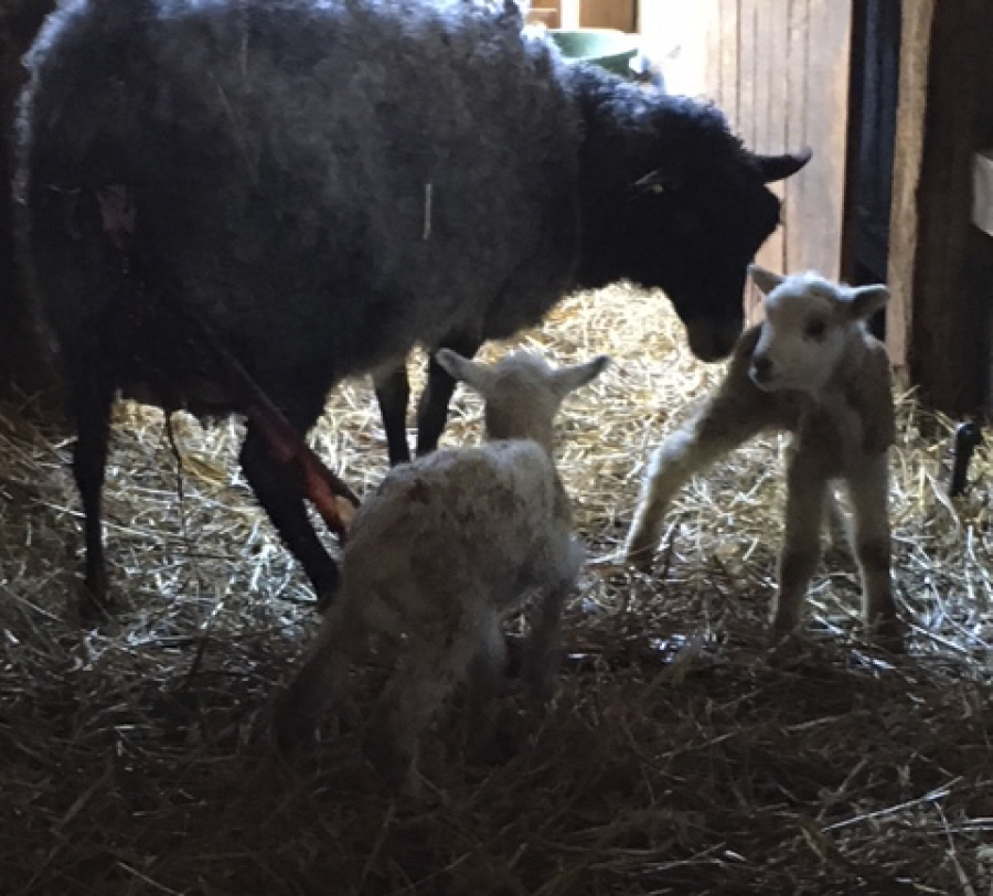 Solveig og hendes tvilling kom til verden i Økologiens Have tirsdag den 21. april 2017. Vi var den aften til bestyrelsesmøde i Haven, og da det var slut var vi nede at se til de nye lam. I rigtigt møgvejr med telefonerne som lygter. De var godt nok meget søde men også meget små, og den ene virkede meget kold. Sanne satte sig ind i halmen og gned lidt varme i den med tørt halm, og fik den puffet hen til yveret, hvor den begyndte at drikke. Desværre holdt det ikke ved. Solveig var ved et uheld faldet/blevet skubbet op i en vandspand, og var blevet meget kold og forkommen, og moderen ville ikke tage sig af den. Derfor blev der nogle timer senere taget en stor beslutning, og Solveig kom med hjem til Sanne. Her har hun boet lige siden, og takket være Sannes indsats er hun nu en værre spilopmager. Solveig følger Sanne som var hun en hund – hun er komplet umulig at stå for!Det er nu maj, og Solveig trives fint i stalden sammen med de andre lam.