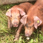 Grisene er 3 måneder gamle. Der er en hun og en kastreret han. De er af blandet race. Faderen er duroc - også kaldet gourmet gris, moderen er blandet yorkshire og dansk landrace.