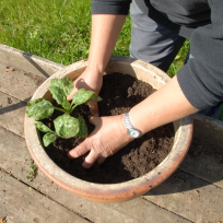 Tag planten ud af potten, dyp den i en spand vand, hvis den virker tør, og fjern det allerøverste lag jord på rodklumpen. Plant i nogenlunde samme dybde i krukken, som planten stod i potten. Fyld jord op omkring rodklumpen og tryk kun let til, så jorden stadig er porøs. Til sidst gennemvandes krukken. Fremover vandes kun, når jorden er tørret ud i jordoverfladen. Gennemvand grundigt – husk: Sjatvanding er pjatvanding! Hvis du går og sjatvander vil planten ikke opbygge et kraftigt og dybtgående rodnet, og dermed har den svært ved at holde sig selv med vand og næringsstoffer.