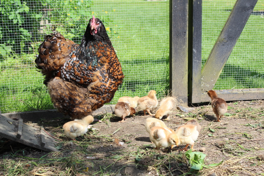 En separat afdeling (minimum ½ m²) til høne med kyllinger (hun skal også have udgang til en bid af hønsegården).