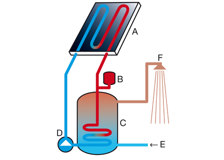 Et solvarmeanlæg omsætter solens energi til varme i et enkelt og lukket kredsløb. Anlægget består udendørs af en eller flere solfangere (en slags omvendt sort radiator(absorberen), som forbindes med varmtvandsbeholderen inde i huset. Solfangeren indeholder vand med frostvæske, som varmes op af solens stråler og pumpes herfra til varmtvandsbeholderen. Her afgiver det sin varme og løber retur til solfangeren.