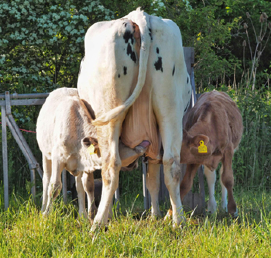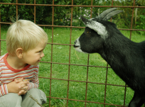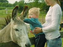 Vi har også en indhegning, hvor der om sommeren går kalve sammen med en ammeko. Ko og kalve er nysgerrige og kommer ofte hen til hegnet for at hilse på.