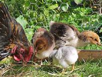 I hønsehuset i parcelhushaven bor der en lille flok høns og en hane. Vi får som regel egne kyllinger hvert forår. Vores hane er en Orpington, en stor og rund kødrace, der kan blive op til 3,5 -4,5 kg. Hønsene er Brahma. Begge racer er omgængelige og rolige, de er gode til mindre haver, da de på trods af deres størrelse ikke kræver meget plads. Begge racer er gode til at lægge æg og til at ruge og passe på deres kyllinger.